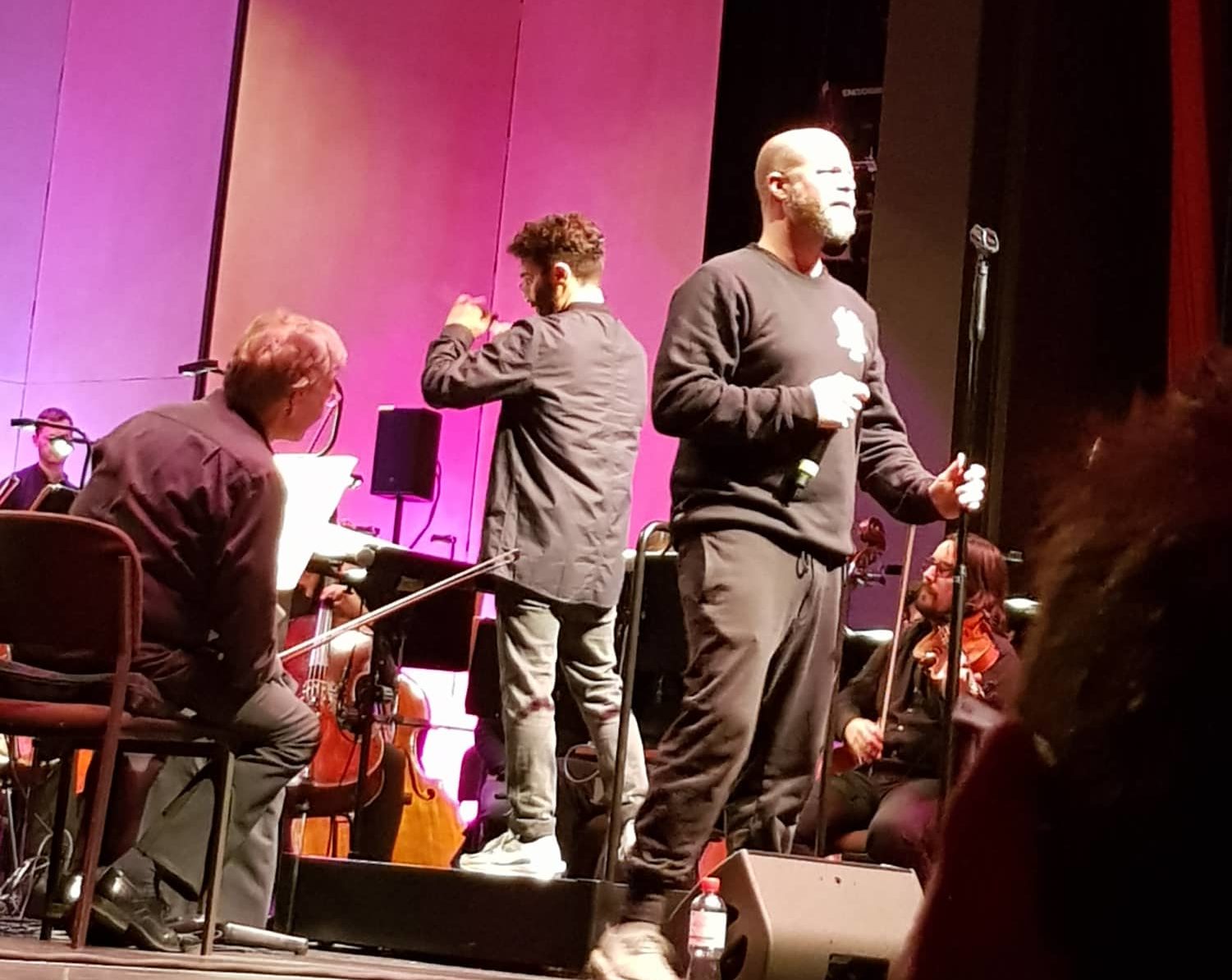 Miki Kekenj (hinten) und Curse gemeinsam mit den Bergisch Symphonikern bei ON FIRE#7. Foto: Steph Hoffmann – www.die-hoffmann.de