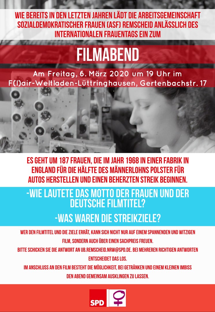 Start Plakat: SPD-Frauen der SPD-Remscheid laden zwei Tage vor dem Internationalen Frauentag zum Filmabend in den Flair-Weltladen in Lüttringhausen. Plakat: SPD-Frauen der SPD-Remscheid laden zwei Tage vor dem Internationalen Frauentag zum Filmabend in den Flair-Weltladen in Lüttringhausen.